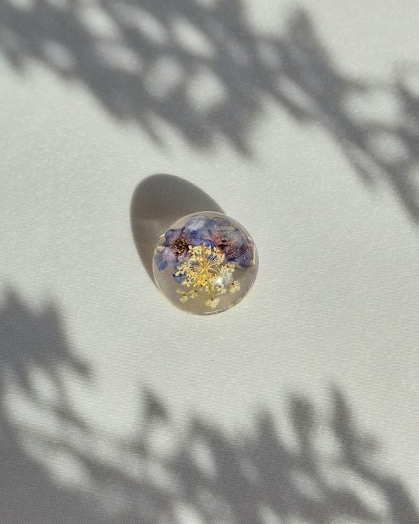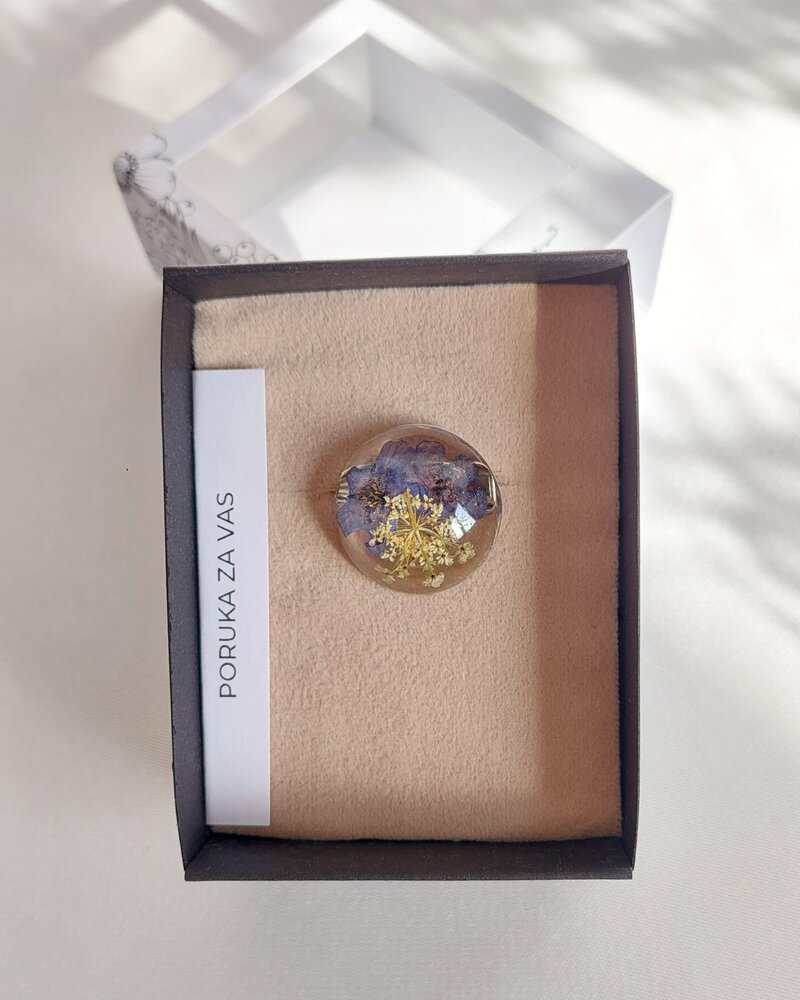 Broš je izrađen sa cvijetom divlje mrkve i plavim cvijetom. Simbol inspiracije, maštovitosti, otvorenosti, ženstvenosti.