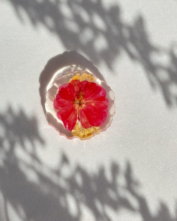 Ovaj statement broš izrađen je sa pelargonijom i alisumom. Simbol snage, sreće, podrške, novih početaka, prijateljstva.