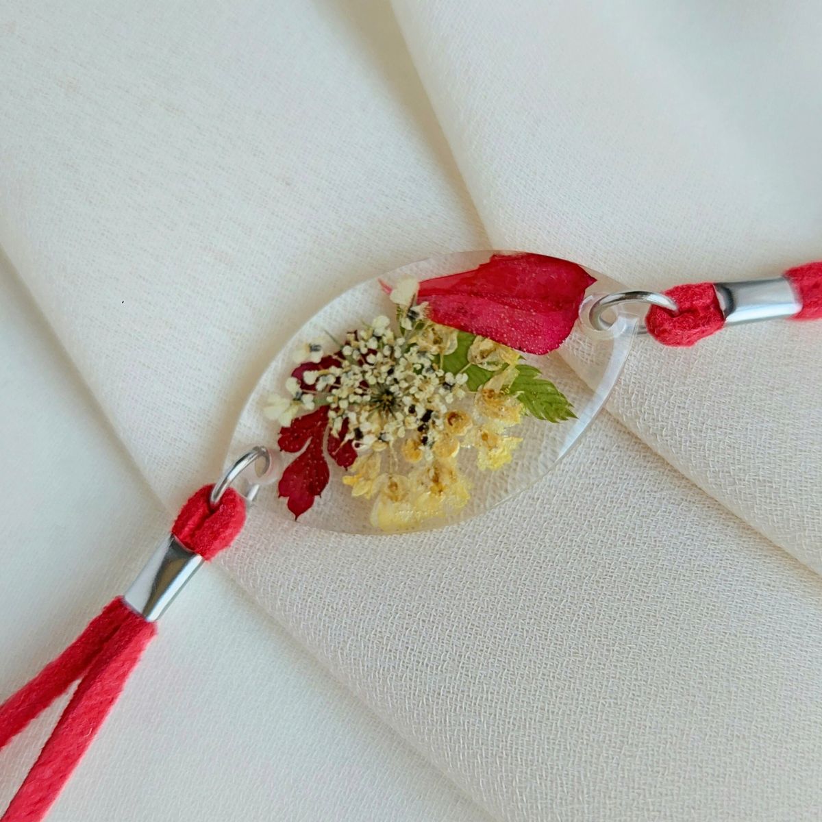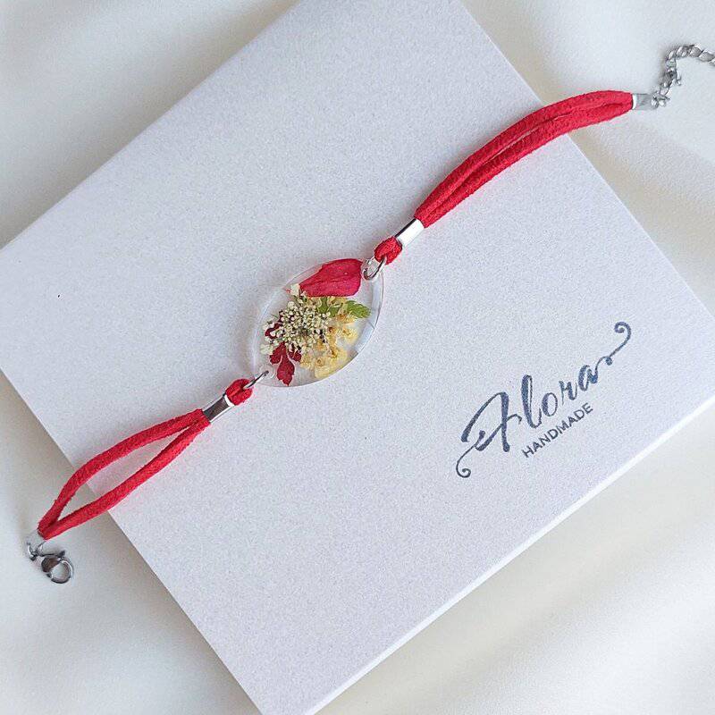 Narukvica je izrađena sa listićima, alisumom, divljom mrkvom i pelargonijom. Simbol prijateljstva, podrške, samopouzdanja, utočišta, snage.