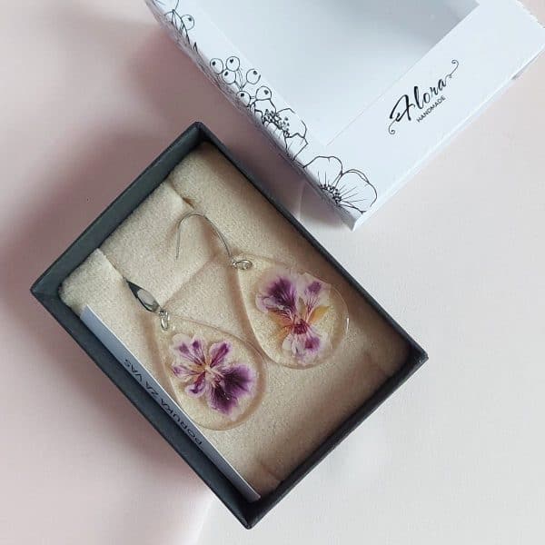 Naušnice su izrađene sa šatiranom pelargonijom koja simbolizira pozitivne emocije i prijateljstvo.
