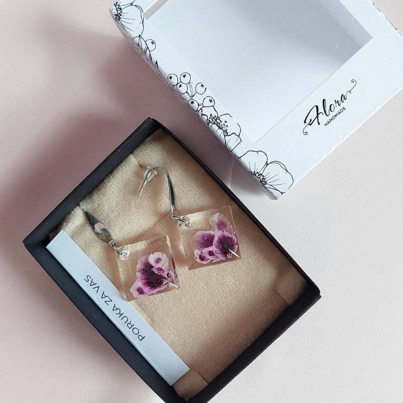 Naušnice su izrađene sa šatiranom pelargonijom koja simbolizira pozitivne emocije i prijateljstvo.