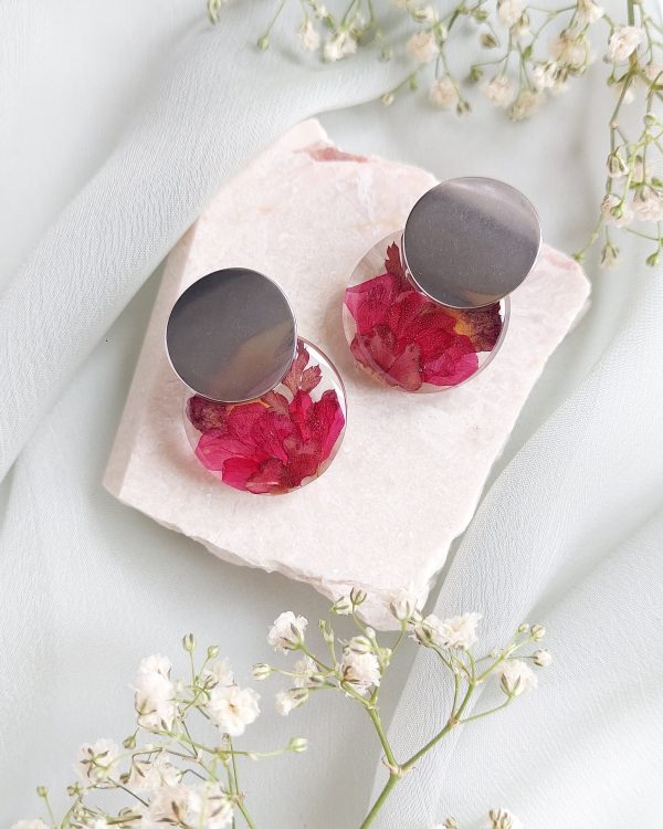 Naušnice su izrađene sa pelargonijom, listićima i verbenom. Simbol snage, samopouzdanja, podrške, sreće, zaštite, ljubavi.