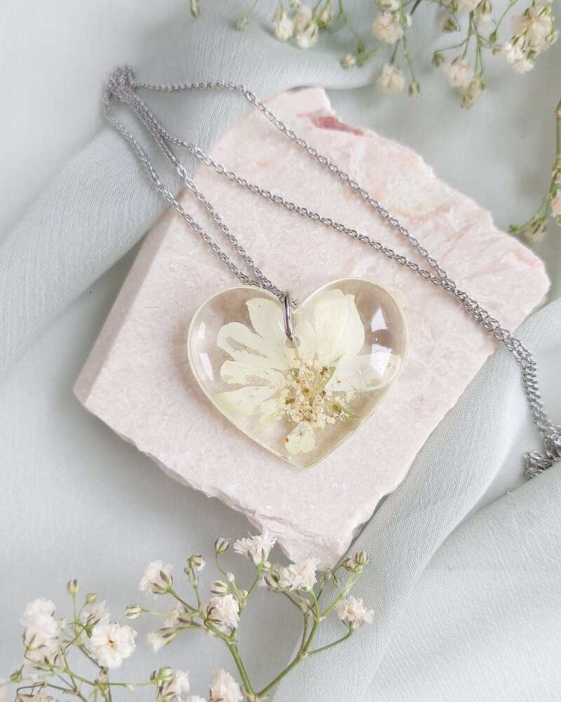 Ogrlica je izrađena sa bijelim cvijetom kao simbol nježnosti i elegancije.