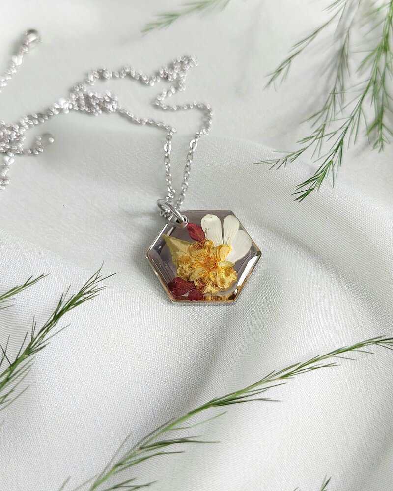 Ogrlica je izrađena na metalnoj podlozi sa listićima, bijelim i žutim cvijećem. Simbol sreće, prijateljstva, iskrenosti, novih početaka.