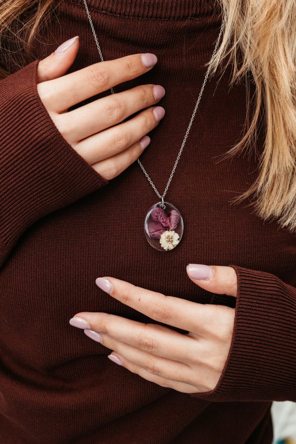 Ogrlica je izrađena sa bijelim cvijetom i laticama cvijeta ukrasne trešnje. Simbol ljepote, elegancije, iskrenosti, ali i novih početaka, prolaznosti i nade.