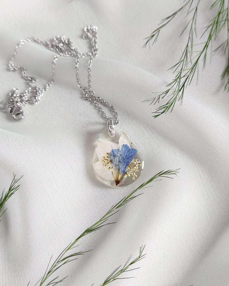 Ogrlica je izrađena sa kokotićem, divljom mrkvom i plavim cvijetom. Simbol hrabrosti, iskrenosti, otvorenosti, maštovitosti, uspjeha.