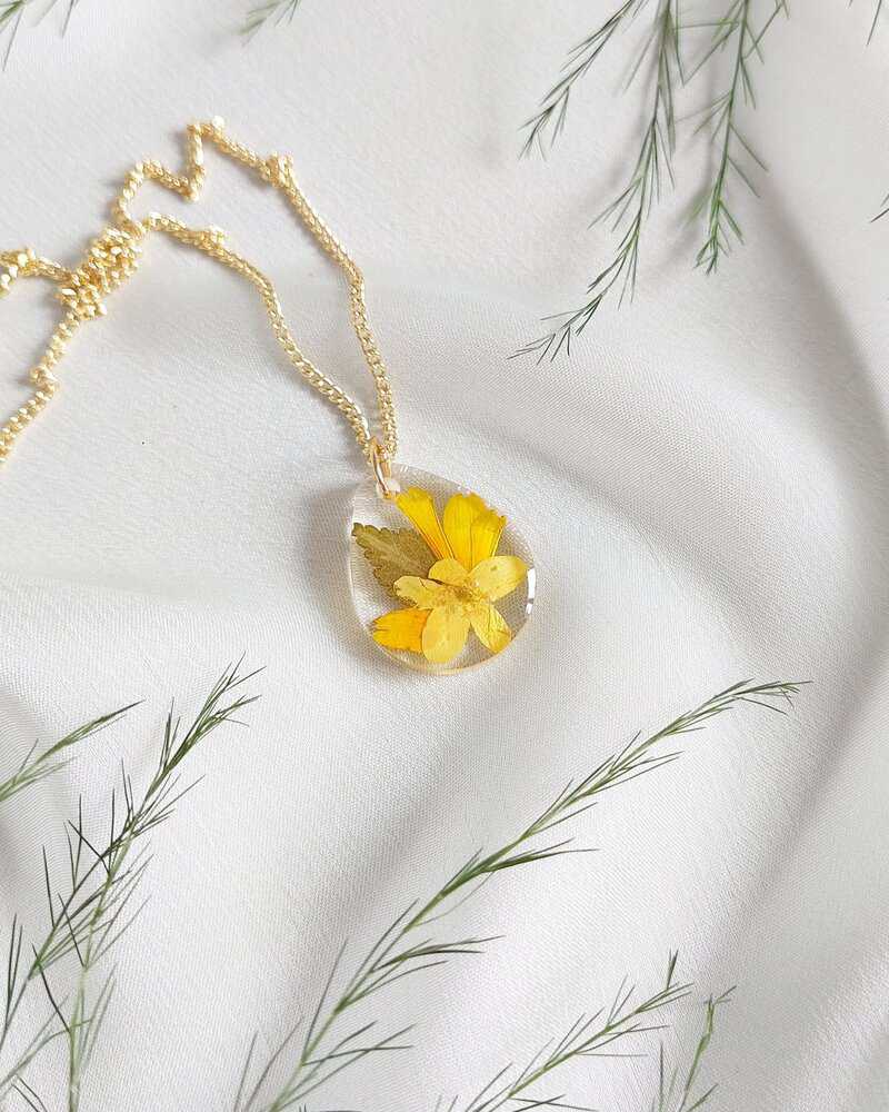 Ogrlica je izrađena sa listićima, žutim cvijetom i laticama rudbekije. Simbol podrške, prijateljstva, motivacije, sreće.