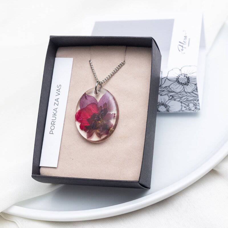 Ova ogrlica nije samo ukras ona je tvoj tihi saveznik. Podsjeća te na trenutke kad si se osjećala snažno, slobodno i svoja. Kada je pogledaš, sjetiš se da si jedinstvena i da nosiš svoju priču baš kao što ona nosi svoju. Izrađena je sa pelargonijom, pakujcem i cvijetom kalanhoe. Simbol snage, samopouzdanja, vjere, nade, upornosti, izdržljivosti, uspjeha, prosperiteta, sreće.