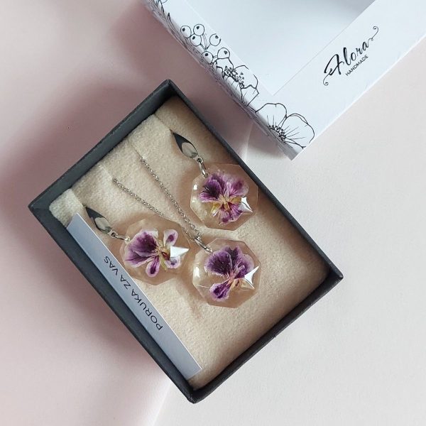 Ogrlica i naušnice su izrađeni sa šatiranom pelargonijom koja simbolizira pozitivne emocije i prijateljstvo.