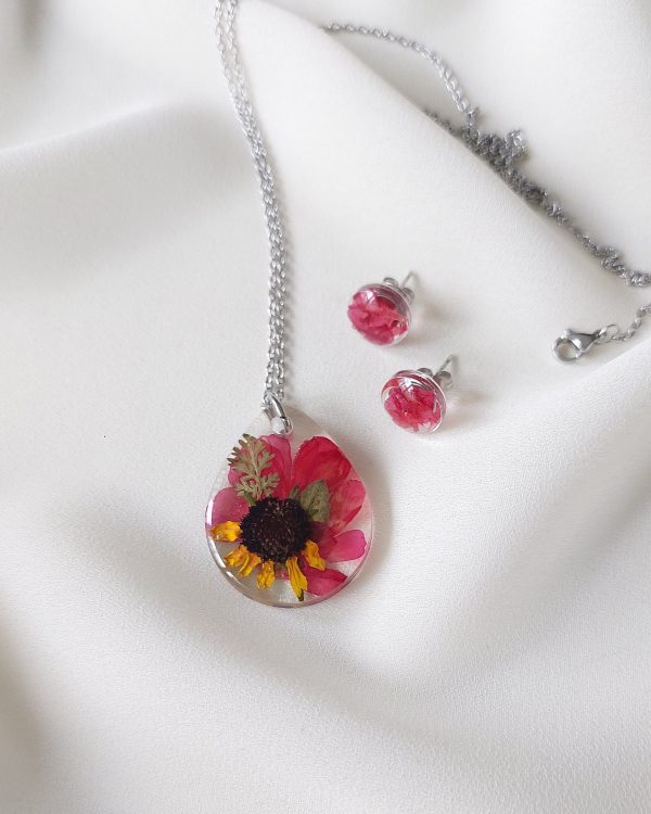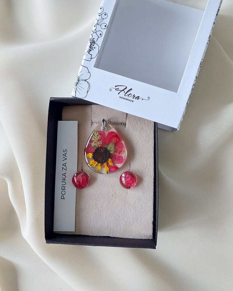 Ogrlica i naušnice su izrađeni sa listićima, pelargonijom i rudbekijom. Simbol snage, podrške, sreće, motivacije, prijateljstva.