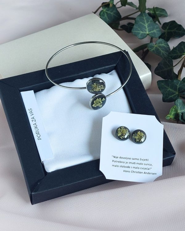Crno-bijela kombinacija s pravim cvijećem u smoli: otvorena narukvica sa dva okrugla elementa i mini naušnice na šaraf koje prate liniju – diskretne, ali prisutne. Ručno rađen i lako uklopiv u dnevne i večernje kombinacije.